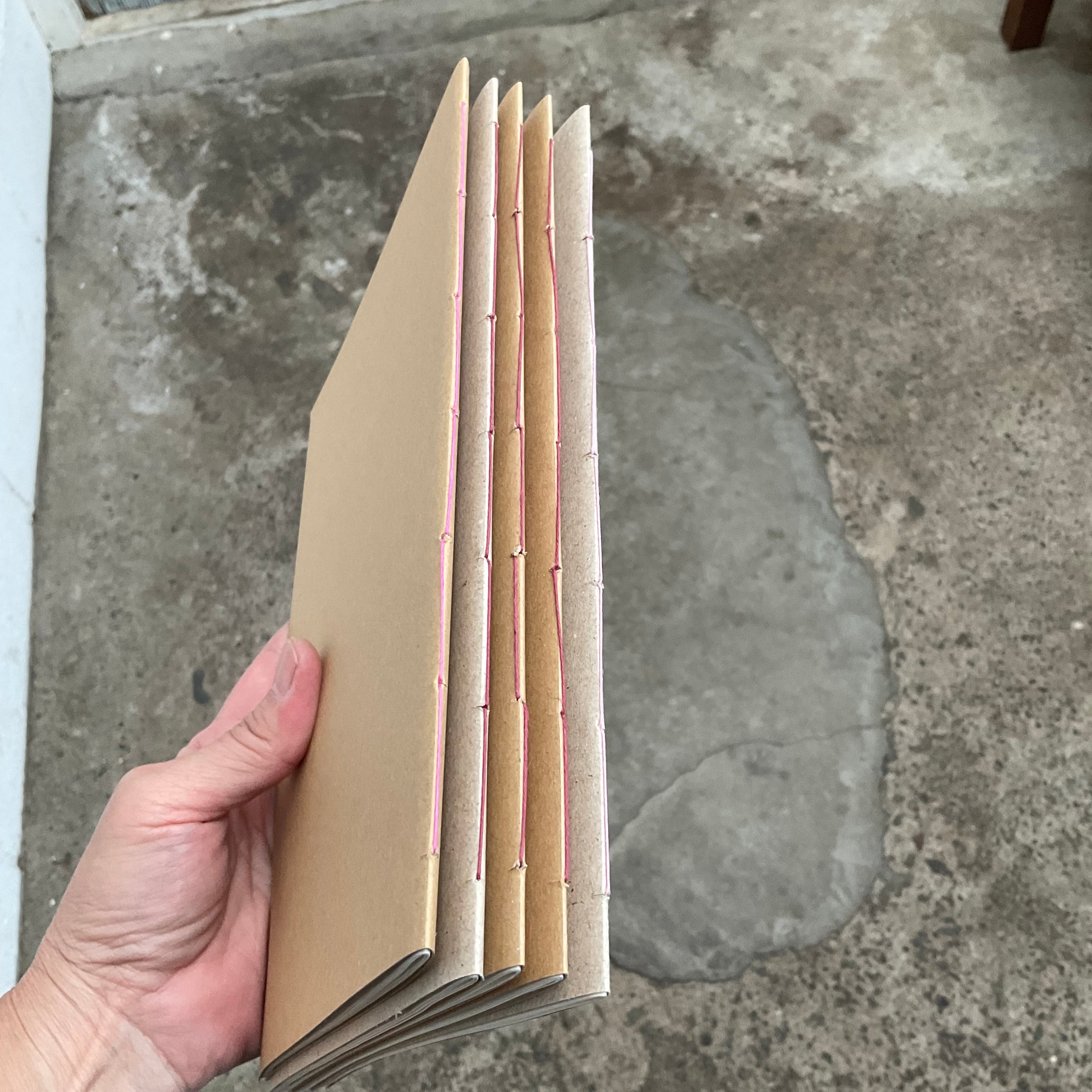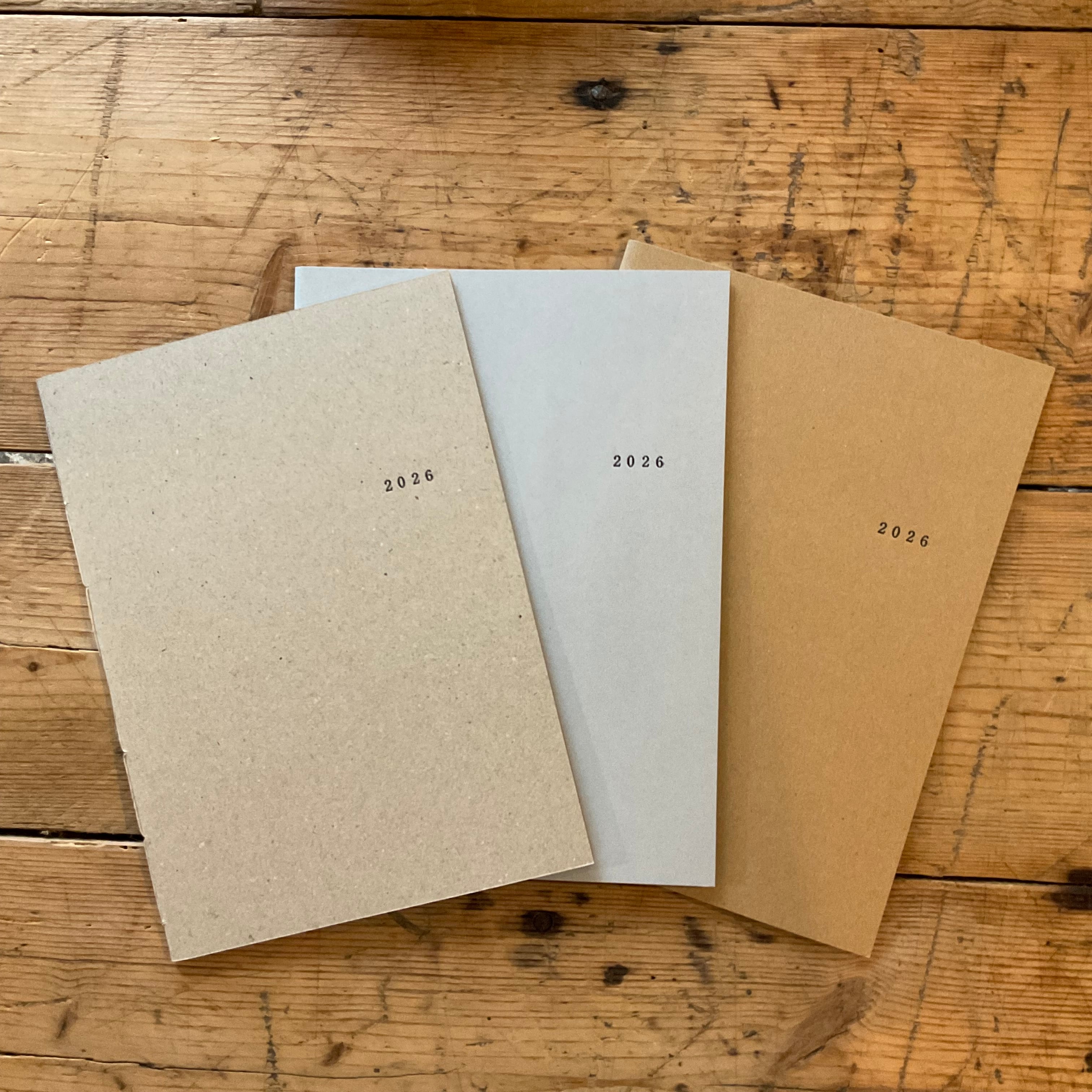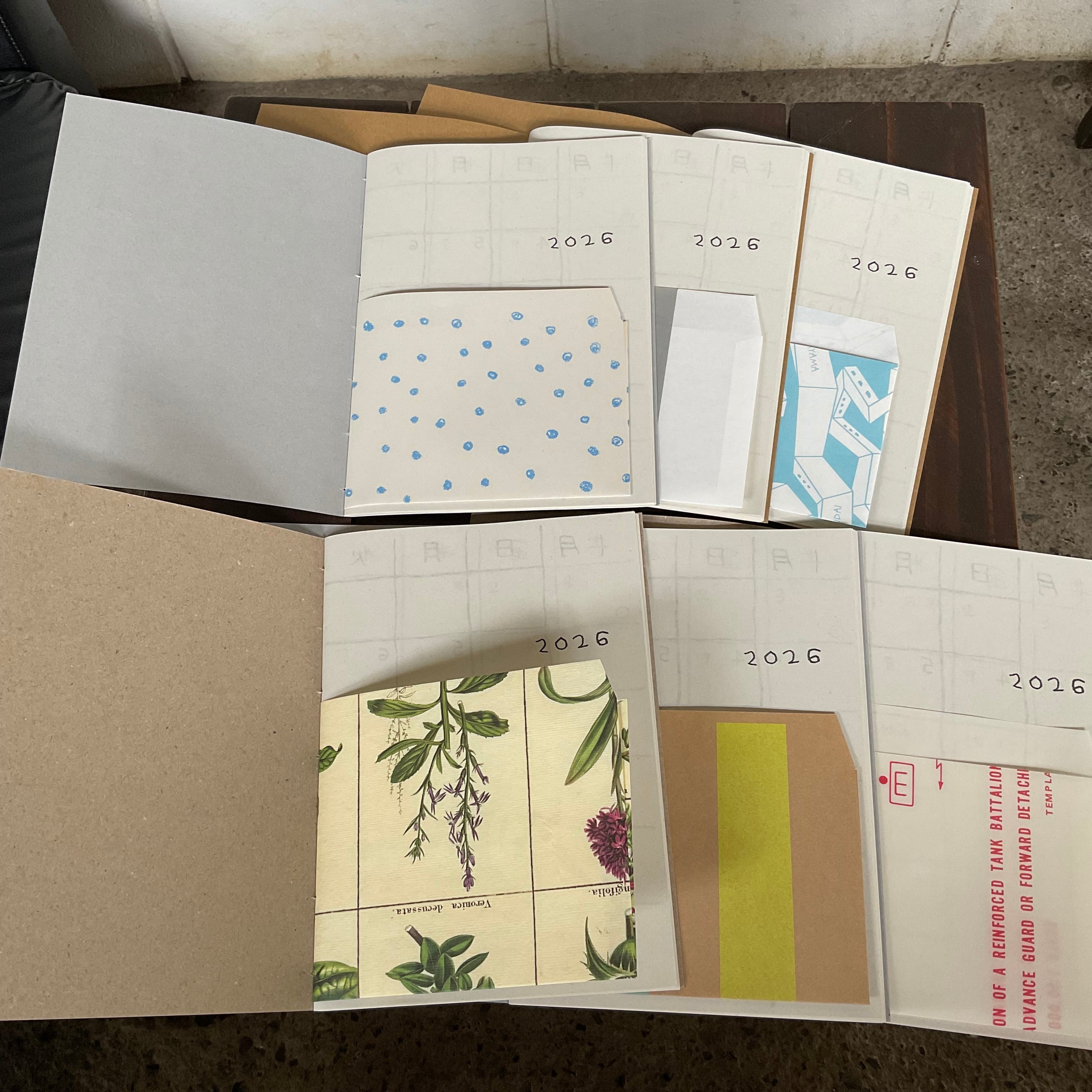 自分たちが使いやすいように作っています。スケジュールページは手書きで書いたものを印刷していますが、ごくごくシンプルな作りです。見開きの1ヶ月カレンダー、無地のページが数ページ、前後にポケットがあります。表紙の紙は3種類、ポケットの紙はいろいろ、綴じている糸の色もいろいろです。どれが届くのかはお楽しみに。